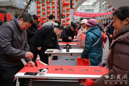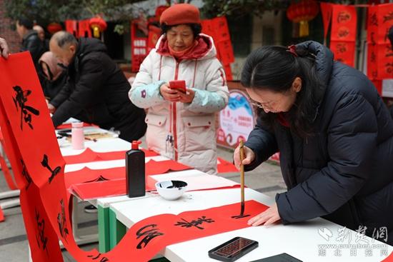 活动现场,红纸铺展,墨香四溢。来自鄂州市美术家协会的35名书画家分赴各点,挽袖执笔,凝神挥毫,笔走龙蛇间,一行行俊逸的书法、一句句真诚的祝福,在笔尖流淌,跃然纸上。