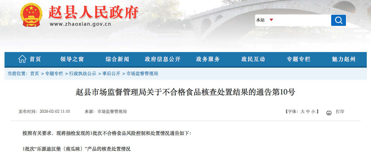 据赵县人民政府官网,2026年2月2日,赵县市场监督管理局发布关于不合格食品核查处置结果的通告第10号公告。