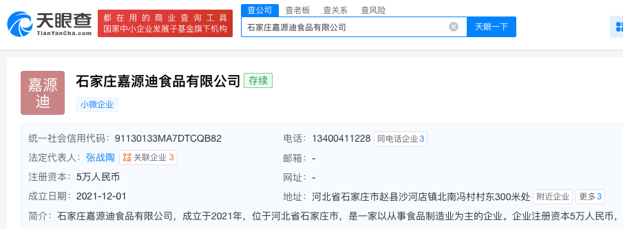 天眼查显示,石家庄嘉源迪食品有限公司,成立于2021年,位于河北省石家庄市赵县,是一家以从事食品制造业为主的企业。企业注册资本5万元。