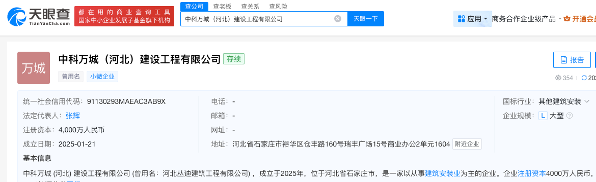 天眼查显示,项目施工单位中科万城(河北)建设工程有限公司,成立于2025年1月21日(成立刚满一年),位于河北省石家庄市裕华区,是一家以从事建筑安装业为主的企业。企业注册资本4000万元。