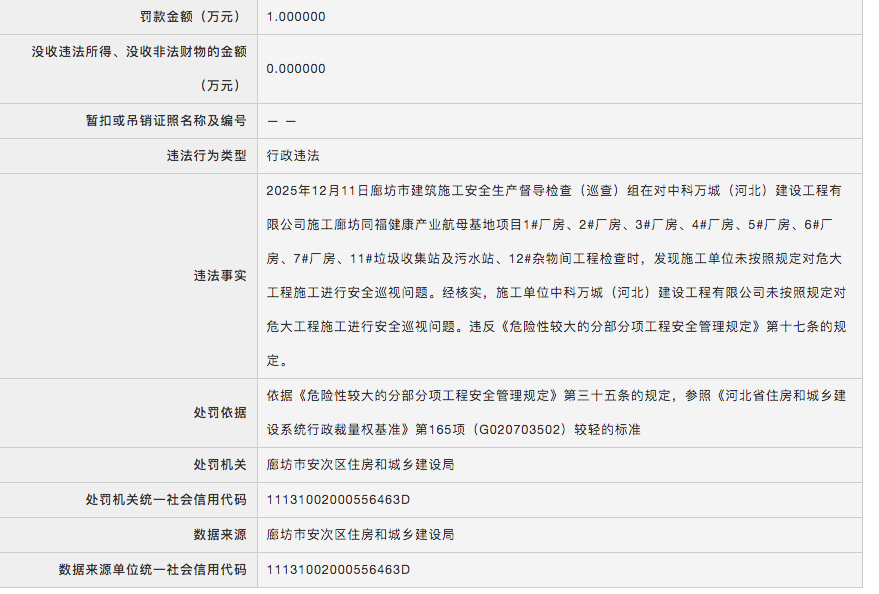 据信用中国(河北廊坊)官网消息,2026年2月3日,因未按照规定对危大工程施工进行安全巡视,中科万城(河北)建设工程有限公司被廊坊市安次区住房和城乡建设局处以罚款1万元。