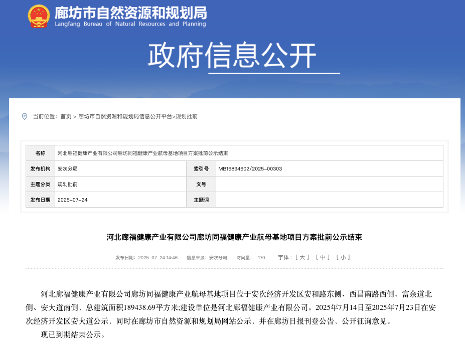 另据廊坊日报此前报道,同福健康产业航母基地项目规划占地800亩,总投资52亿元,涵盖展览服务、仓储物流、生产研发等多个领域。据廊坊市自然资源和规划局,该项目建设单位为河北廊福健康产业有限公司(同福集团全资子公司)。