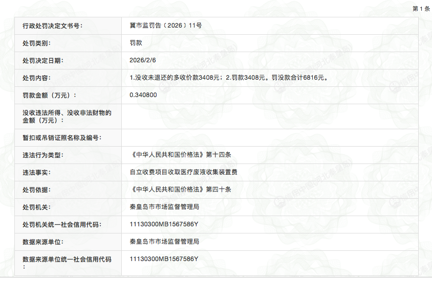 据信用中国(河北秦皇岛)官网公开信息,2026年2月6日,因自立收费项目多收费,秦皇岛慈善医院被秦皇岛市市场监督管理局行政处罚,罚没合计6816元。