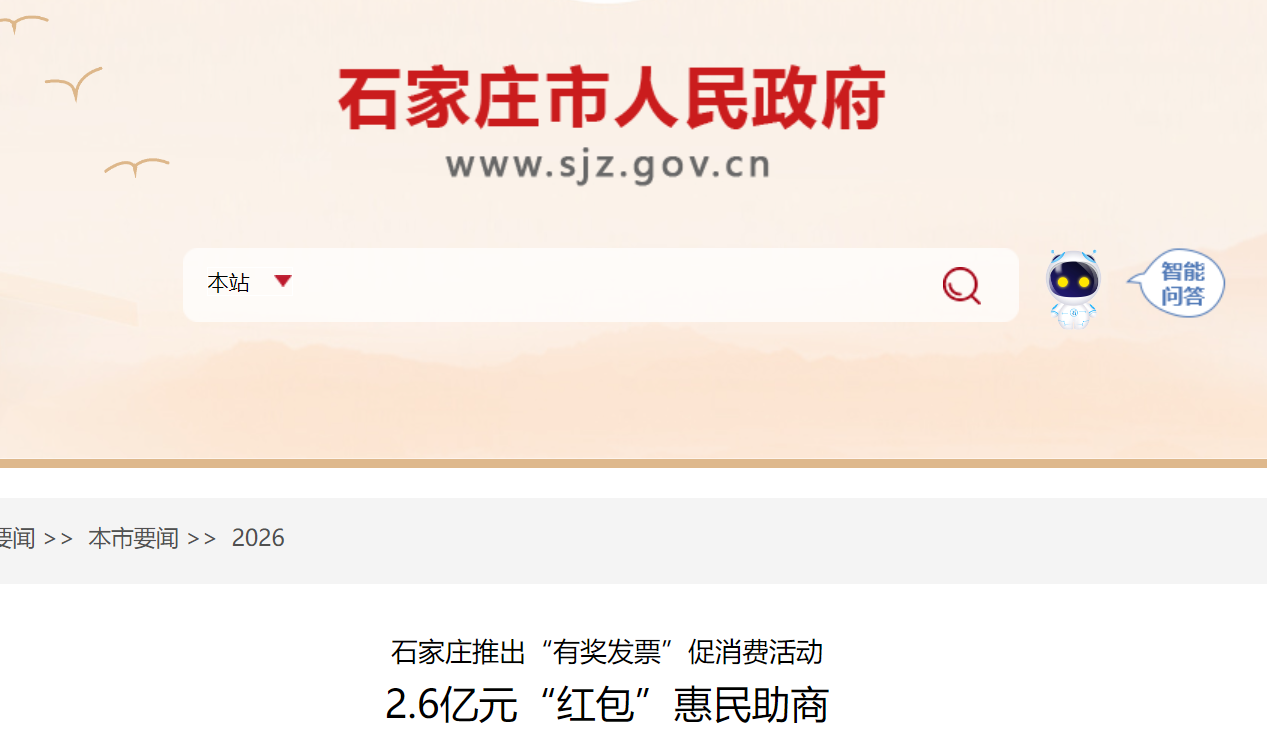 2月11日,石家庄市启动“有奖发票”促消费活动。活动总奖金规模达2.6亿元。活动期间,个人消费者在零售、餐饮、住宿、旅游等领域消费并开具符合规定的电子发票,即有机会参与抽奖,单张发票最高可获800元电子红包。
