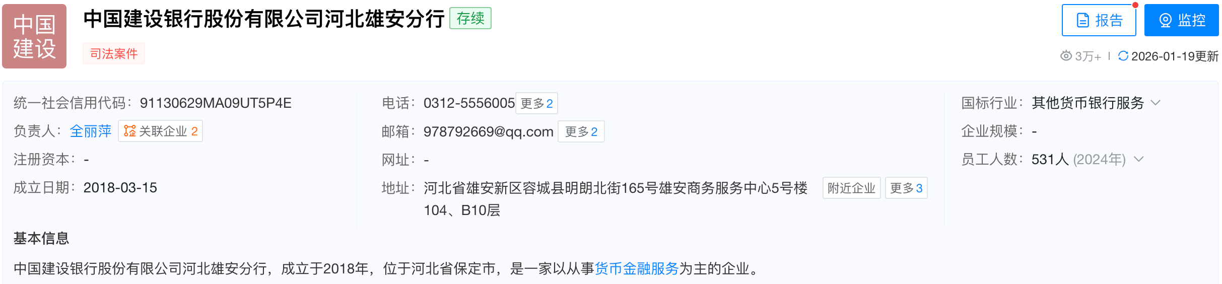 天眼查显示,中国建设银行股份有限公司河北雄安分行,位于河北省保定市,成立于2018年,是一家以从事货币金融服务为主的企业,统一社会信用代码为91130629MA09UT5P4E,负责人为全丽萍。