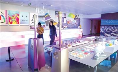 特展开幕现场,两位肢残人士戴上智能仿生手写书法、弹钢琴。