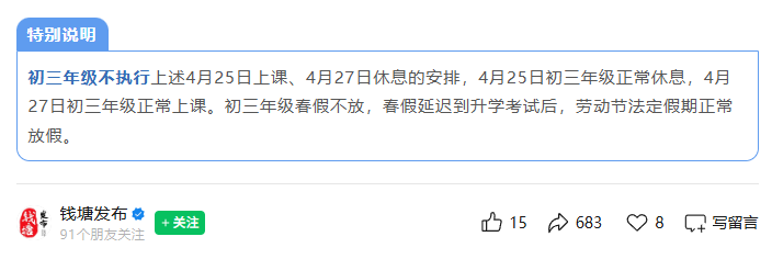 需要注意的是,初三年级不执行上述4月25日上课、4月27日休息的安排,4月25日初三年级正常休息,4月27日初三年级正常上课。初三年级春假不放,春假延迟到升学考试后,劳动节法定假期正常放假。