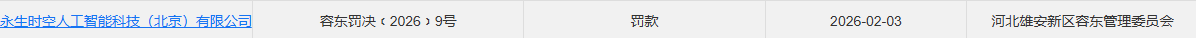 依据《中华人民共和国广告法》第五十八条第二项法律法规,河北雄安新区容东管理委员会决定对永生时空人工智能科技(北京)有限公司作出罚款15万元的行政处罚,处罚决定日期为2026年2月3日。