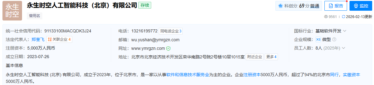 天眼查显示,永生时空人工智能科技(北京)有限公司,成立于2023年,位于北京市,是一家以从事软件和信息技术服务业为主的企业,法定代表人为郑奎飞,注册资本5,000万人民币。