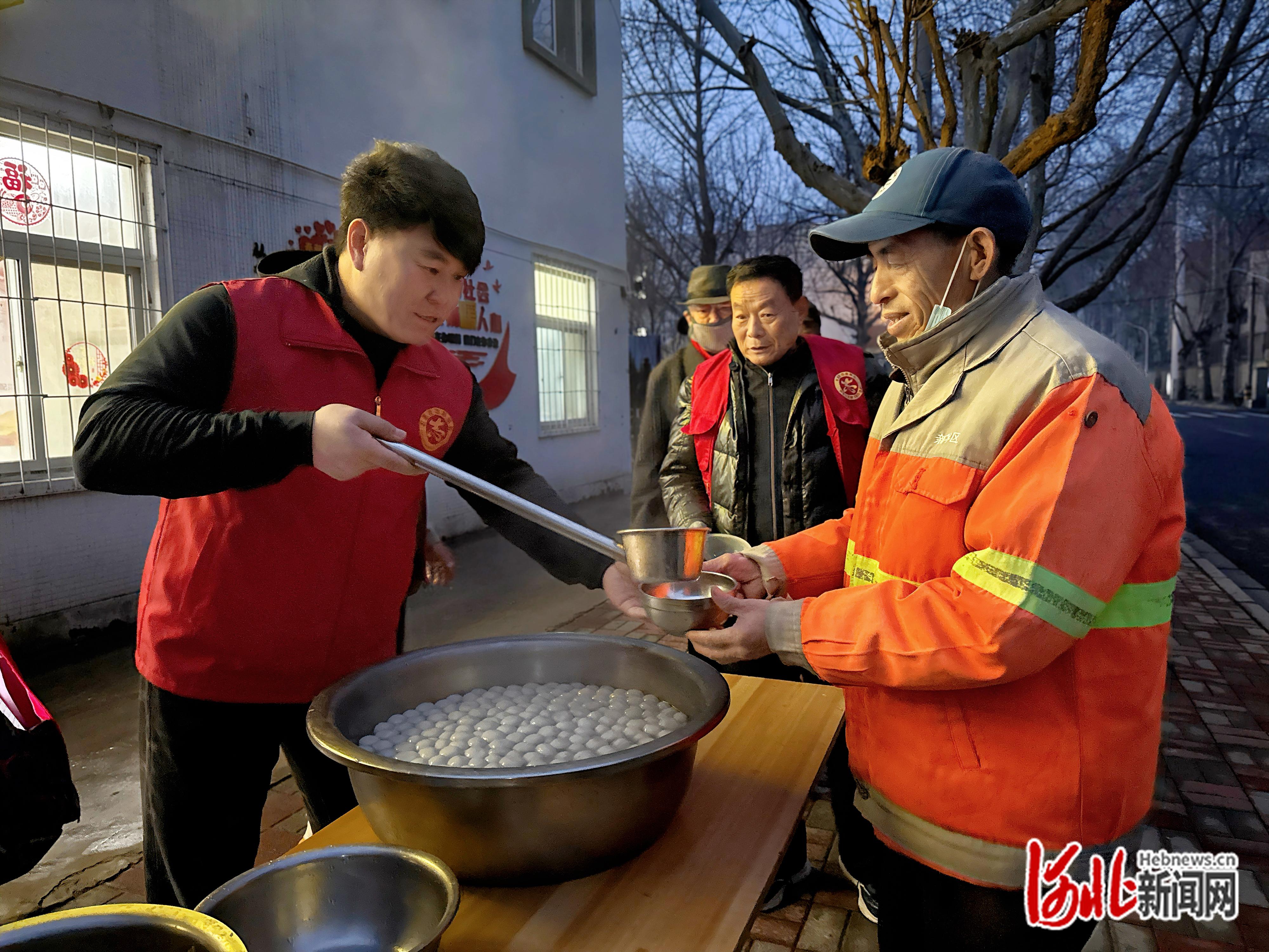 “张师傅,快趁热来碗元宵,刚煮好的!”6点半,刘文江笑着将一碗热气腾腾的元宵递到环卫工人武建新手中。今年50多岁的武建新负责周边三条街道的清扫工作,春节至今一直坚守岗位,凌晨2点就开始作业。